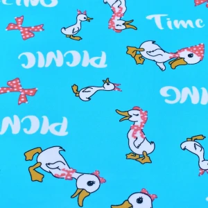 This interlock fabric is soft and smooth to the touch. The texture is gentle to baby skin. The Duckling printed design with sweetie duck. It’s perfect for kid\'s clothing. Available in 4 different colourways: Yellow, Pink, Blue and Purple.